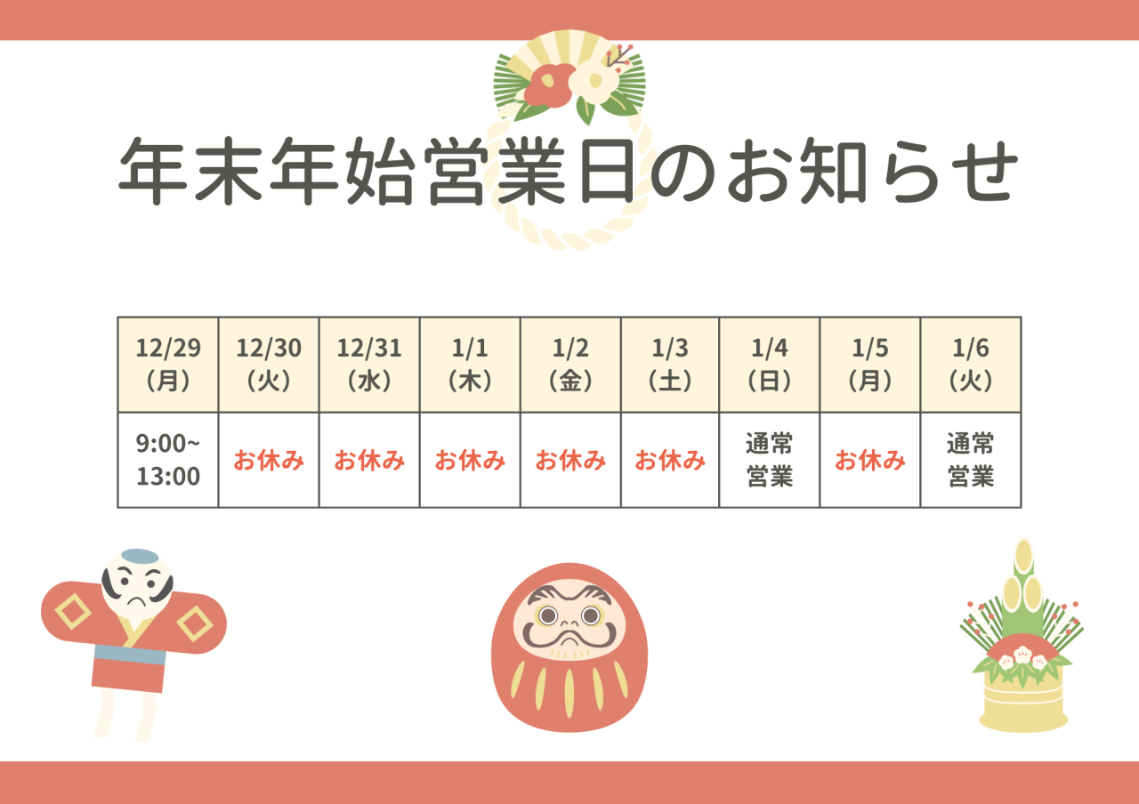 年内最終営業日の12/29は9:00~13:00までの営業となります。