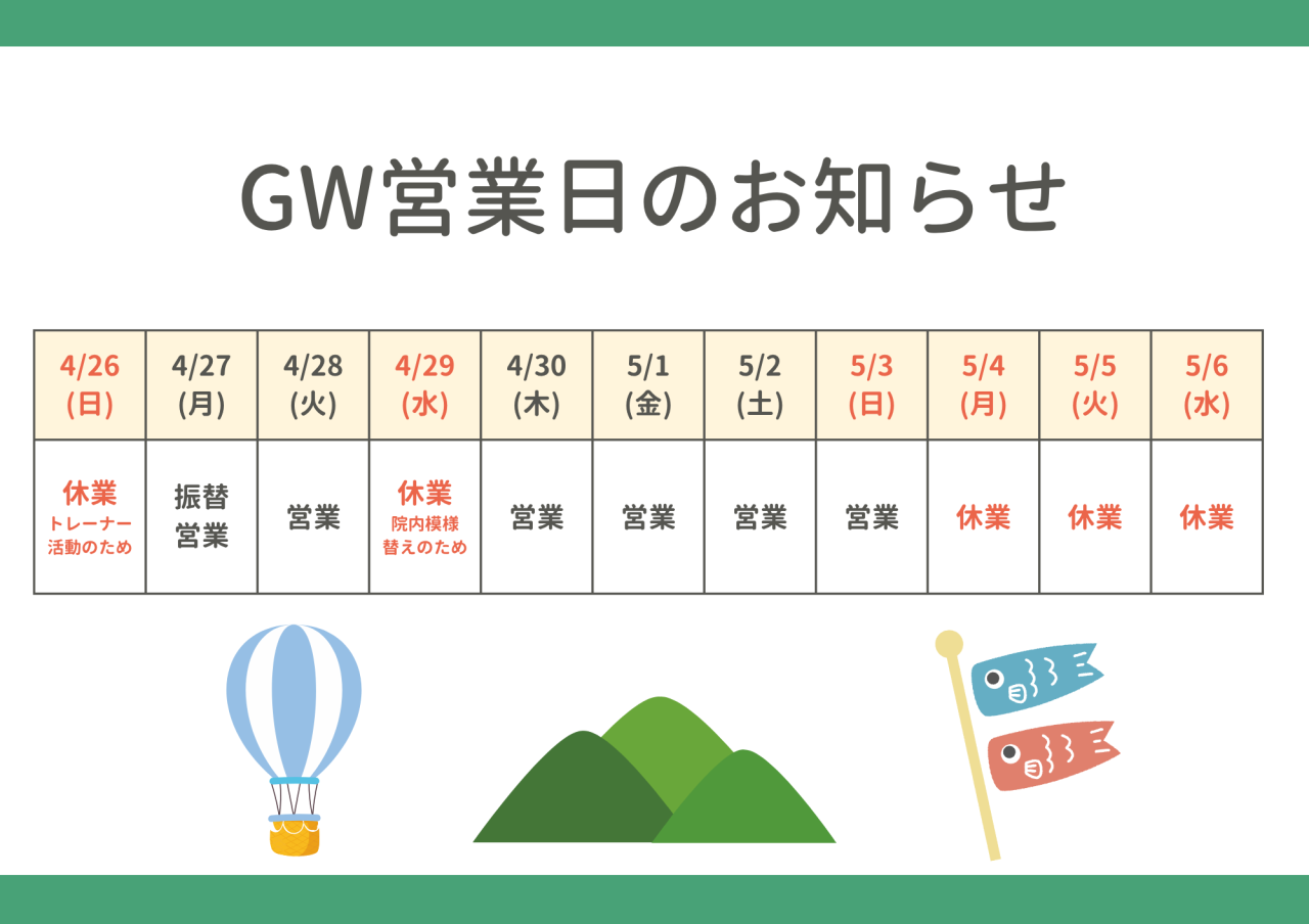 4/26(日)はトレーナー活動のため、4/29(水・祝)は院内模様替えのため臨時休業となります。